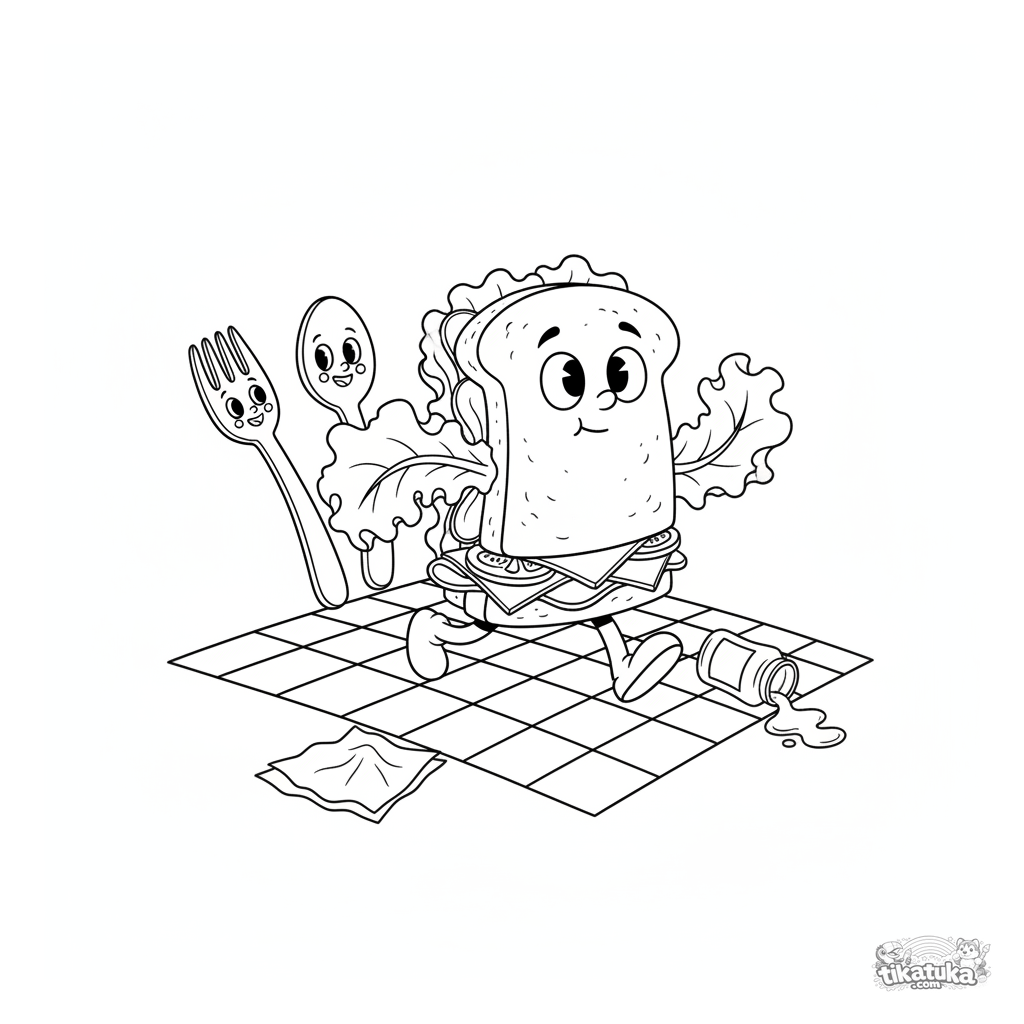 Divertida página para colorear de un sándwich gigante corriendo perseguido por utensilios felices. Para niños de 4 a 6 años.
