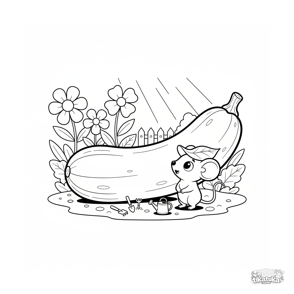 Página para colorear de un calabacín gigante y un ratón jardinero en un huerto. Para niños de 7-9 años. Escena con vegetal gigante, ratón pequeño y herramientas.