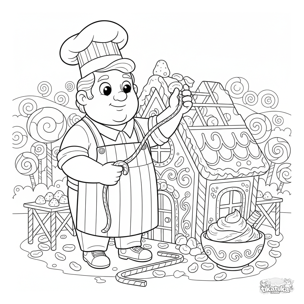 Intrincada página para colorear de cuento: un constructor de dulces edifica una casa de jengibre. Para niños de 8 a 12 años. Detalles incluyen andamios de bastón de caramelo, un bol de glaseado y ladrillos de gominola.