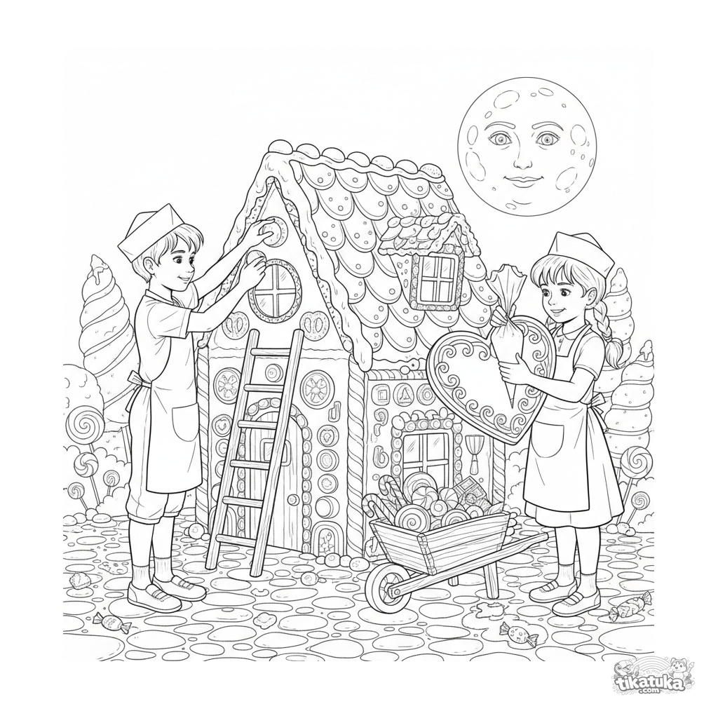 Página para colorear de cuento de hadas: Hansel y Gretel construyen su famosa casa de jengibre, decorándola con dulces. Para niños de 6 a 9 años.