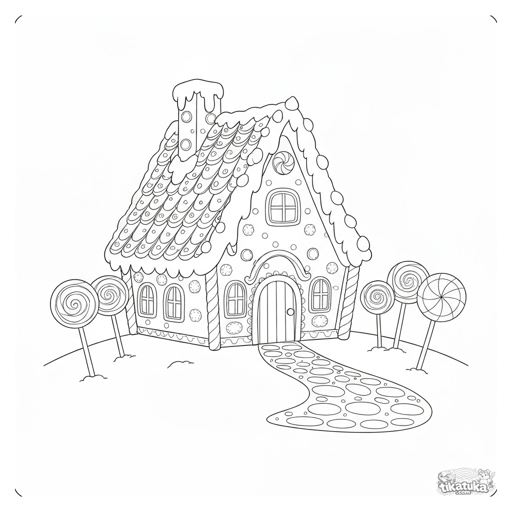 Página para colorear de cuento: la casa de jengibre de Hansel y Gretel. Casa hecha de galletas y caramelos con árboles de piruleta. Para niños de 5 a 8 años.
