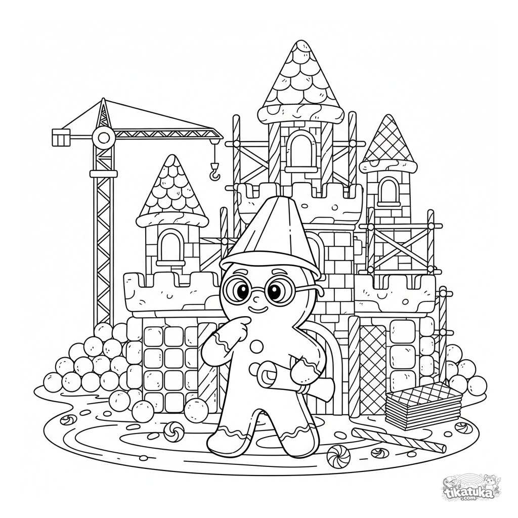 Página para colorear de cuento de hadas para niños de 5-7 años. Un hombre de jengibre arquitecto inspecciona una obra de un castillo de caramelo.