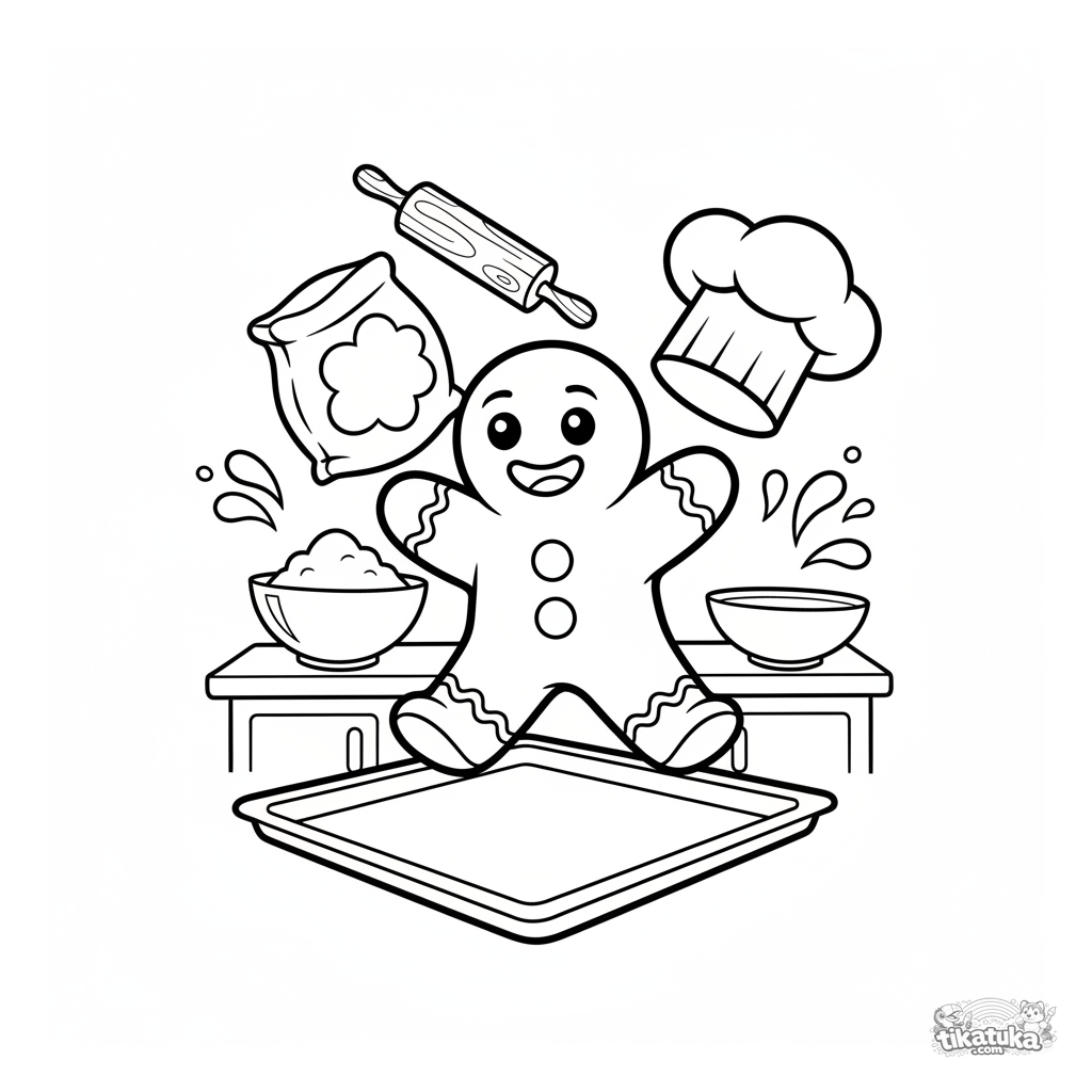 Página simple para colorear del cuento del Hombre de Jengibre, huyendo de una bandeja de horno. Para niños pequeños de 2 a 5 años. Escena divertida con harina y rodillo.