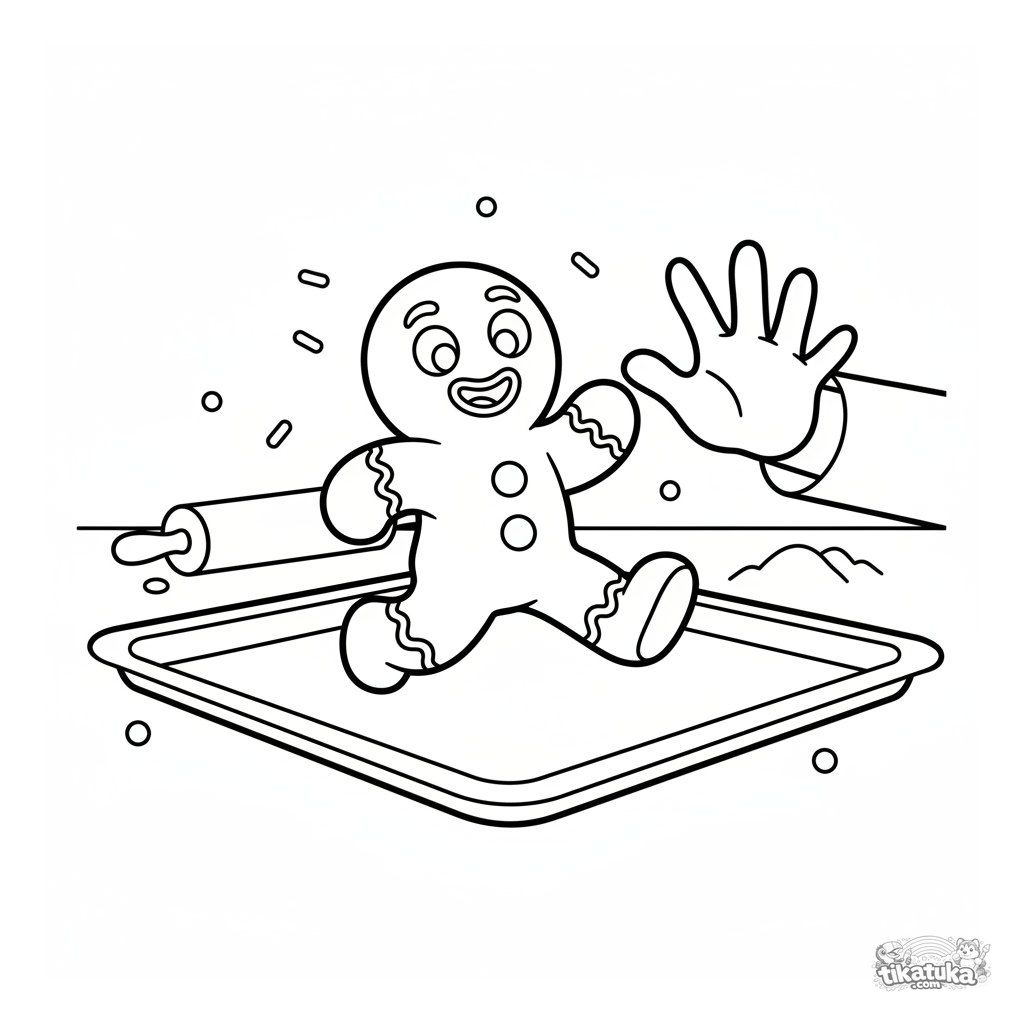Página simple para colorear para niños pequeños 2-3 años: un hombre de jengibre travieso huye por una bandeja de horno de la mano de un chef. Formas muy grandes y simples, casi sin fondo.