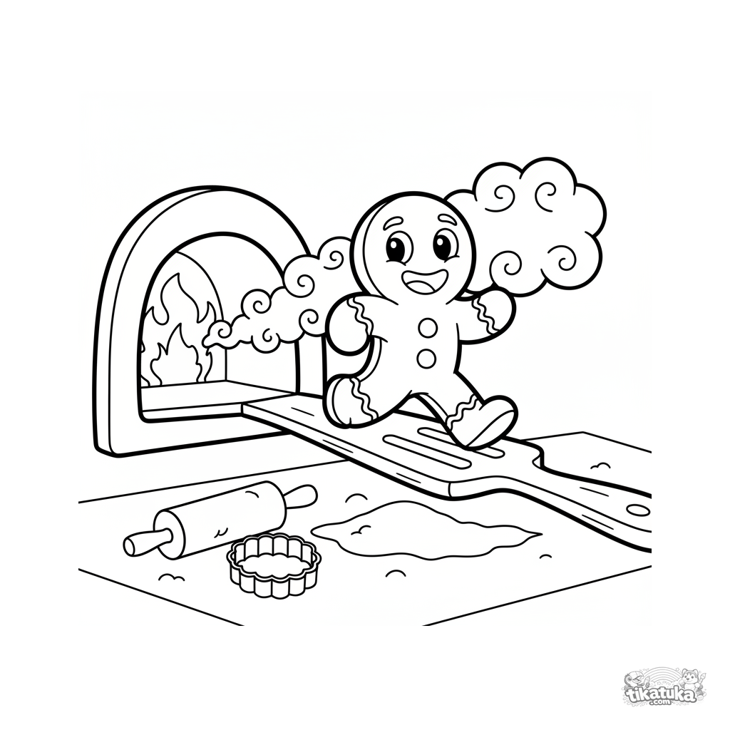 Página para colorear del cuento del Hombre de Jengibre. Para niños pequeños de 2 a 5 años. El hombre de jengibre huye del horno.