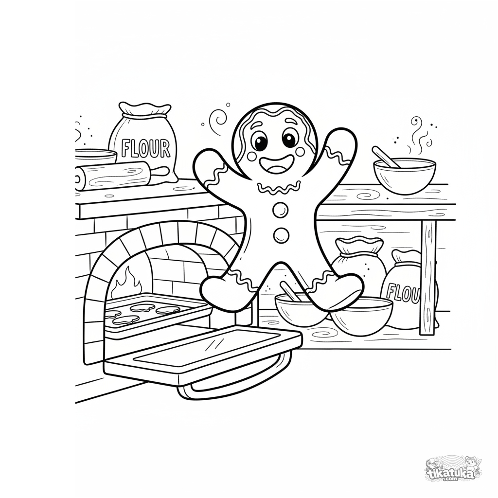 Página para colorear de cuento: El Hombre de Jengibre huyendo del horno en una panadería acogedora. Para niños de 5 a 8 años. Escena divertida con ojos de caramelo y utensilios de cocina.