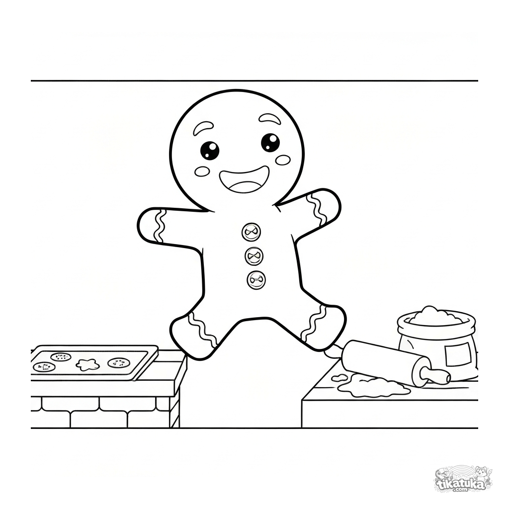 Página para colorear del cuento: el Hombre de Jengibre huyendo del horno. Para niños pequeños de 2 a 5 años. Escena simple.