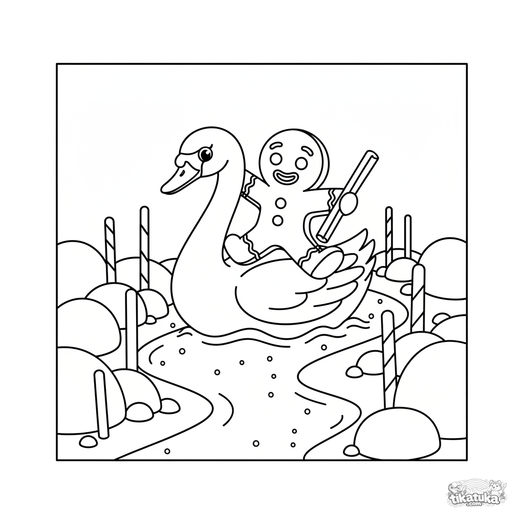 Página para colorear del cuento: el Hombre de Jengibre montando un cisne por un río de azúcar glas. Sencilla para niños de 2-5 años.