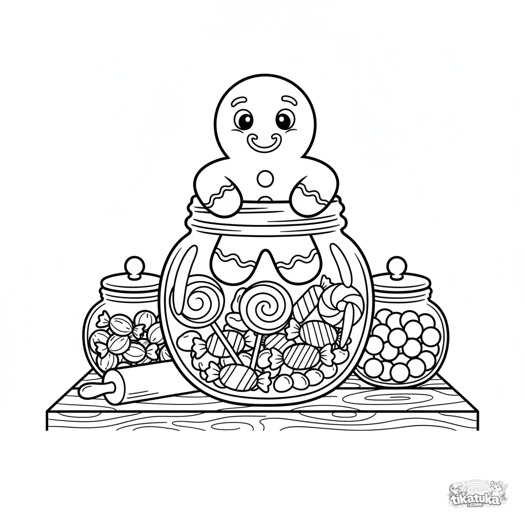 Página para colorear de un hombre de jengibre asomándose desde un tarro de galletas. Para niños pequeños de 2 a 5 años.