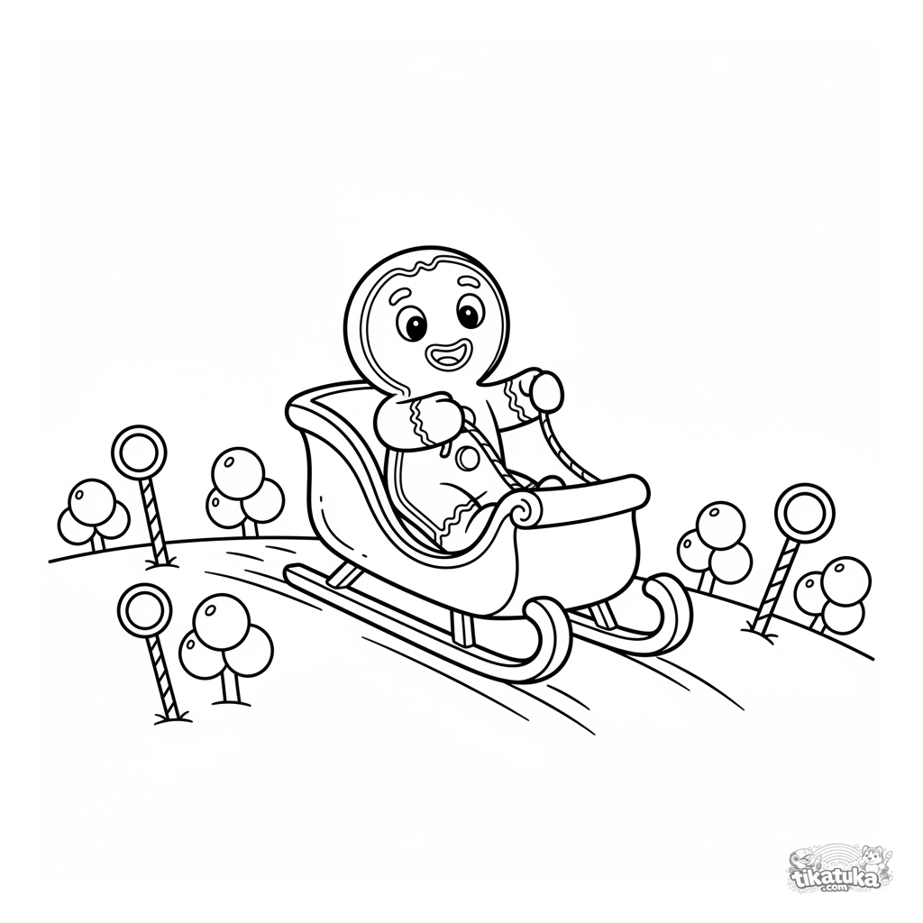 Página para colorear fácil para niños pequeños de 2 a 5 años: un hombre de jengibre feliz monta un trineo de bastón de caramelo por una colina de glaseado.