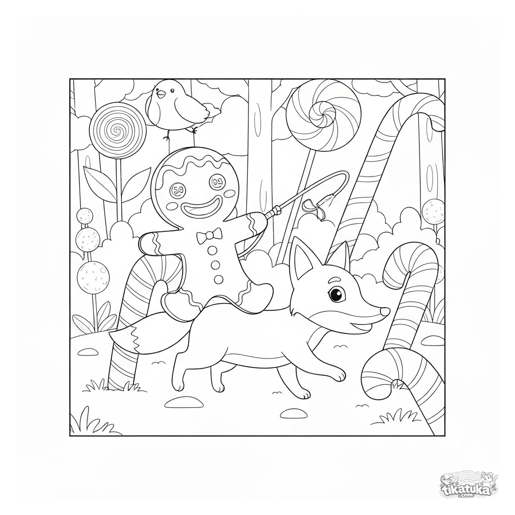 Página para colorear de cuento de un hombre de jengibre montando un zorro por un bosque mágico de bastones de caramelo. Para niños de 6 a 9 años.