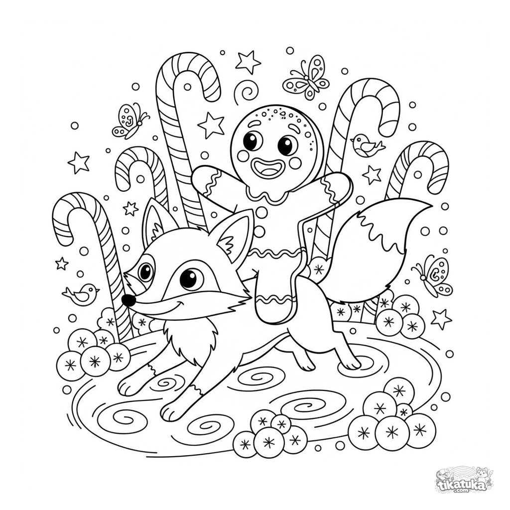 Página para colorear de un cuento: un hombre de jengibre monta un zorro por un bosque de bastones de caramelo. Escena dulce y mágica para niños de 6-9 años.