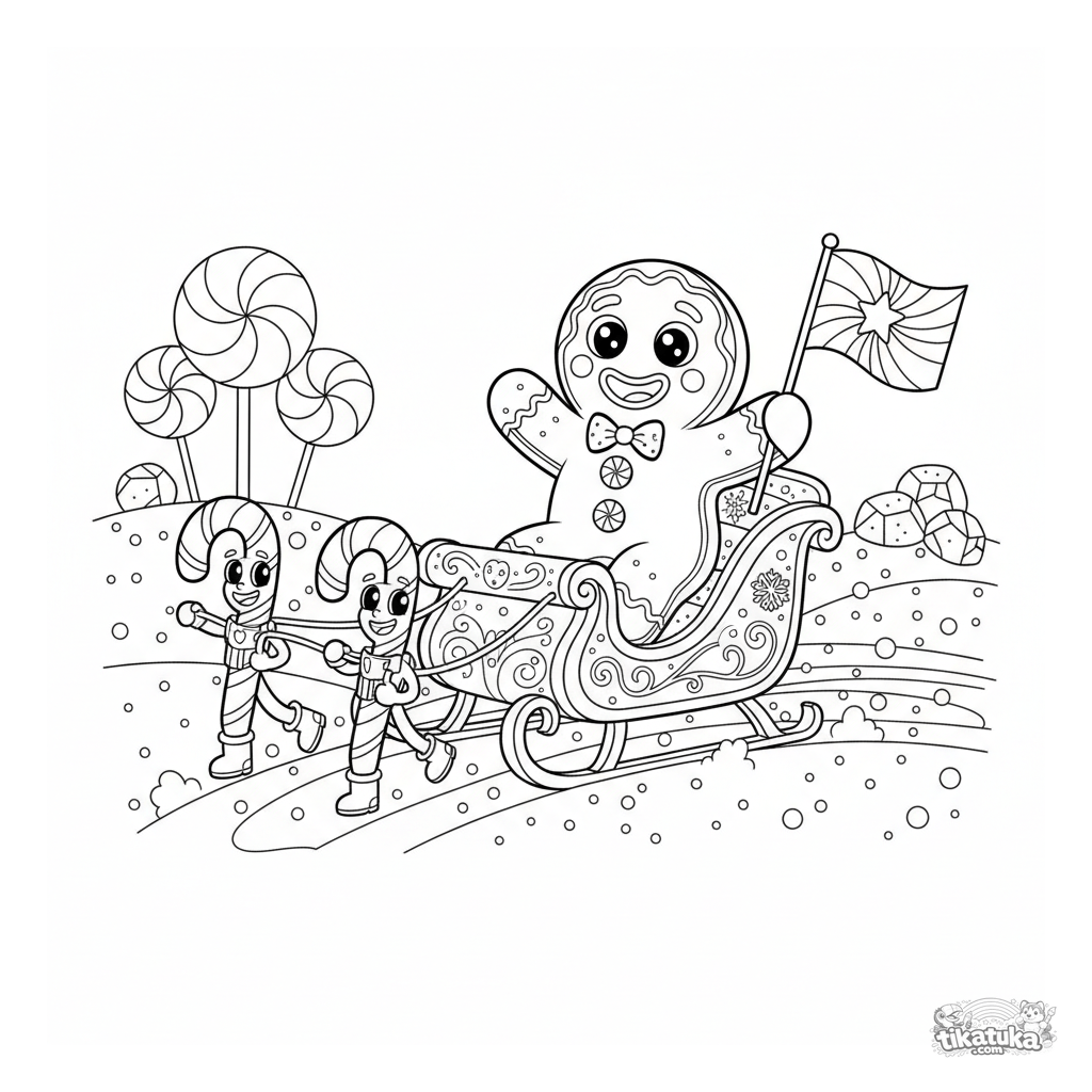 Página para colorear de cuento de un hombre de jengibre en un trineo de glaseado tirado por bastones de caramelo. Para niños de 5 a 8 años.