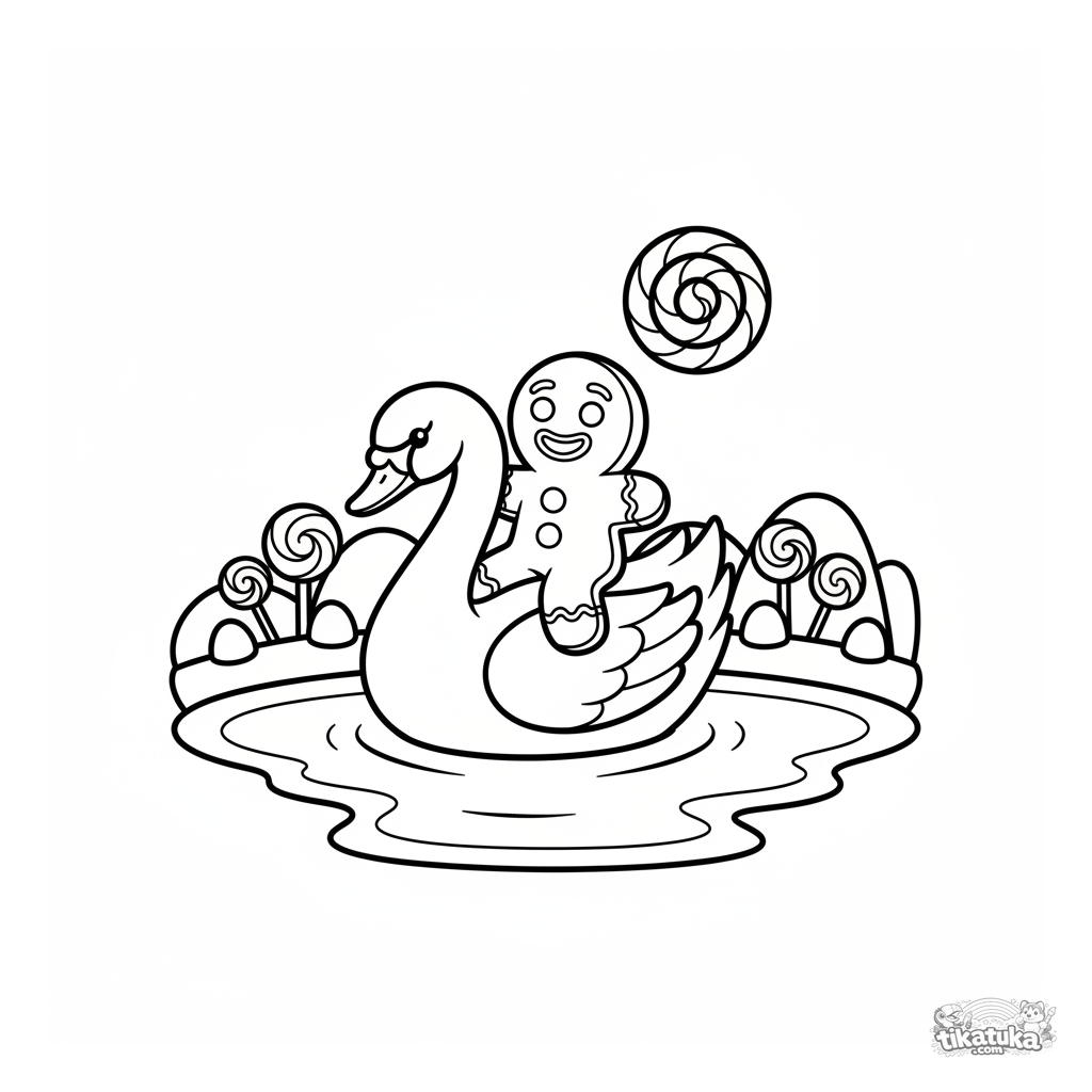 Página de cuento para colorear: un alegre hombre de jengibre monta un cisne de glaseado por un lago de leche en Tierra de Dulces. Para niños pequeños de 2 a 5 años.