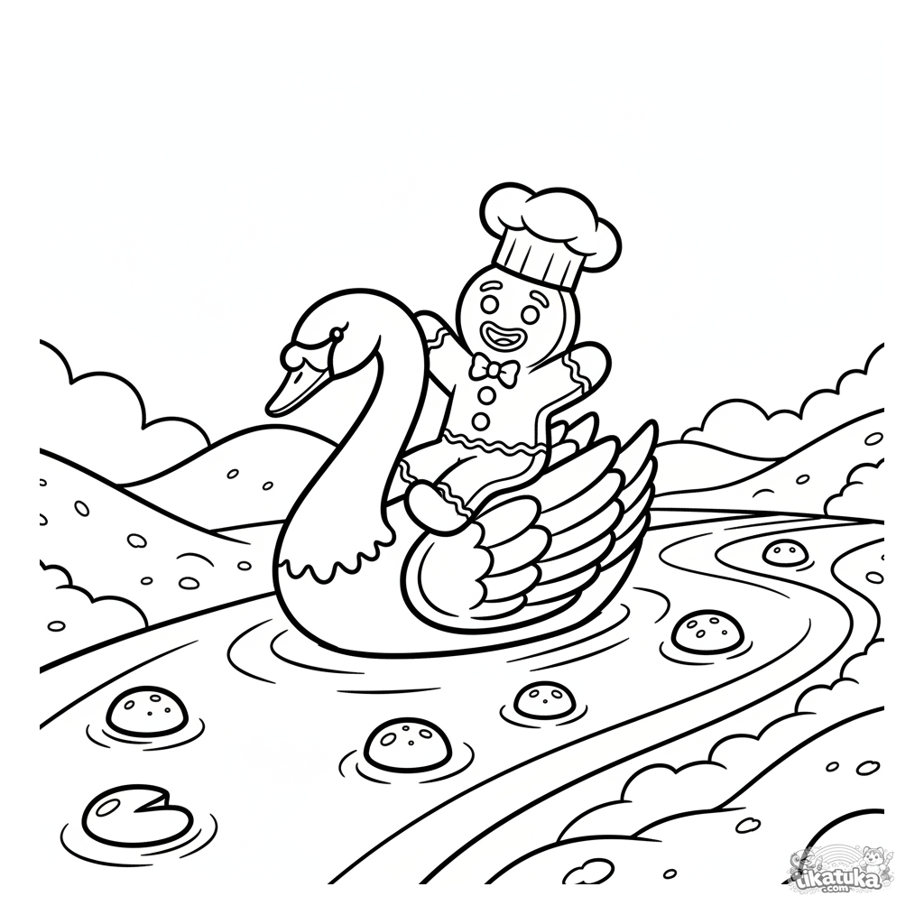 Página para colorear de un feliz hombre de jengibre montando un cisne de glaseado por un río de leche. Para niños pequeños de 2 a 5 años.