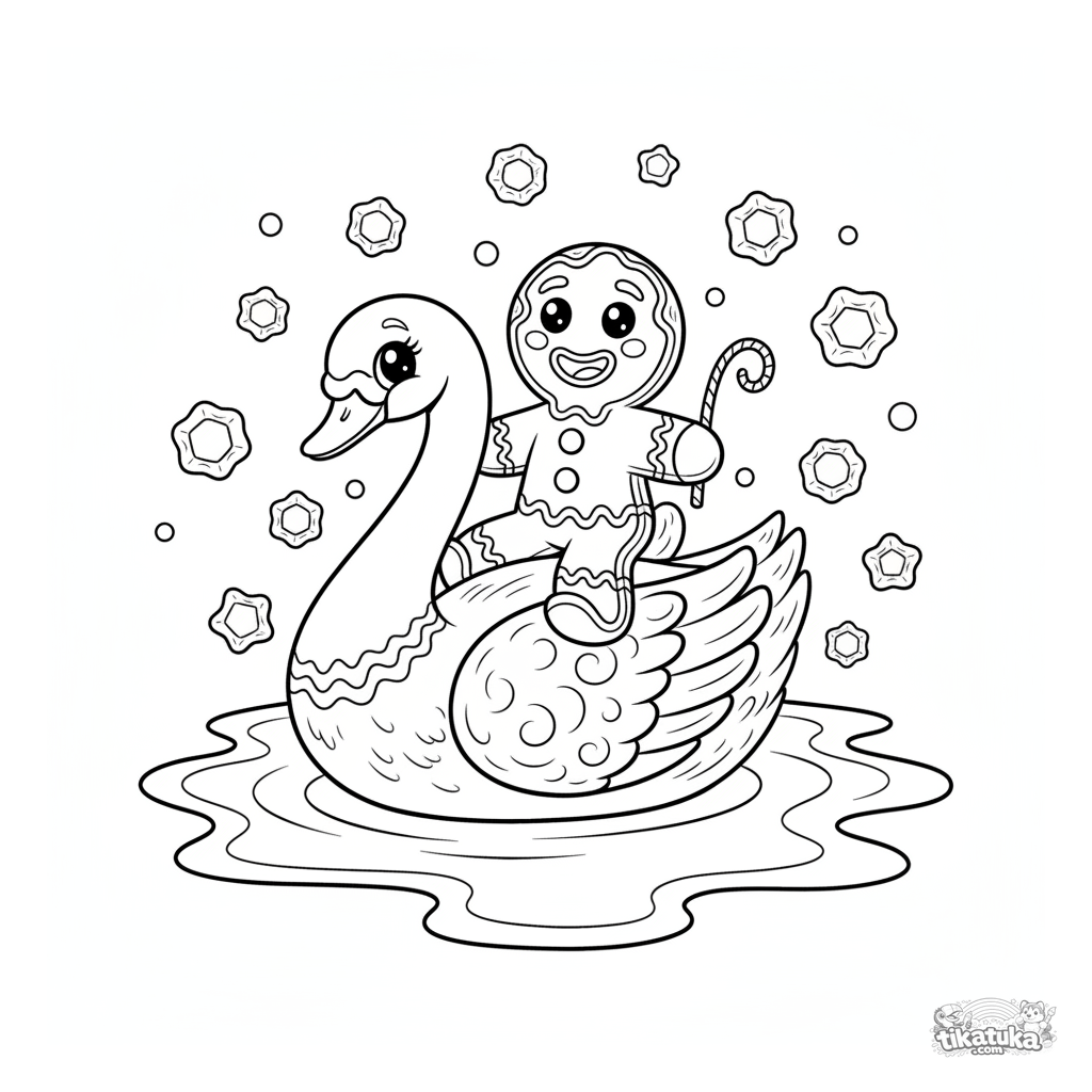Página para colorear de un alegre hombre de jengibre montando un cisne de glaseado en un lago lechoso. Para niños de 5 a 8 años.