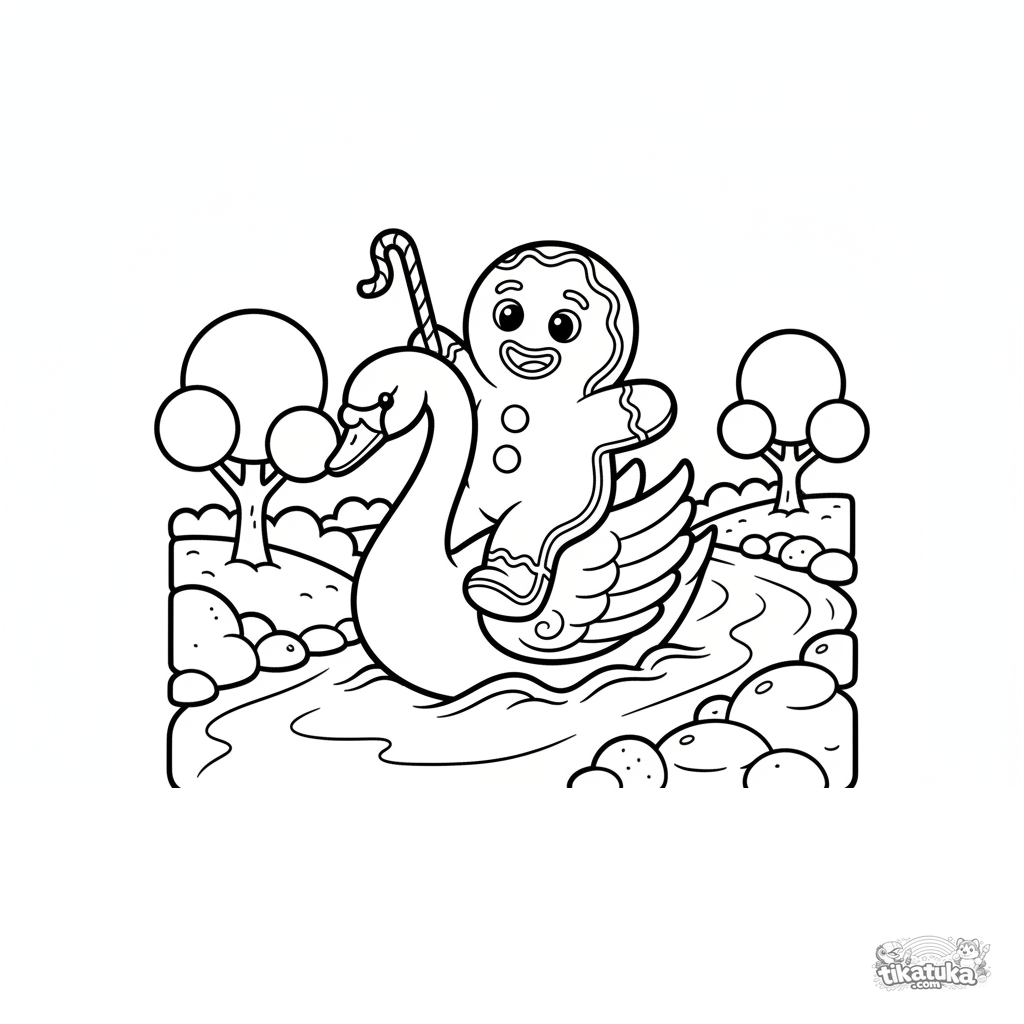 Página fácil para colorear para niños pequeños: un hombre de jengibre montando un cisne de glaseado. Para niños de 2 a 5 años.