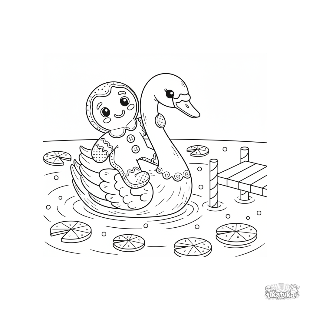 Página para colorear de cuento de hadas: un hombre de jengibre montando un cisne de glaseado en un lago lechoso. Para niños de 6 a 9 años. Escena dulce y mágica.