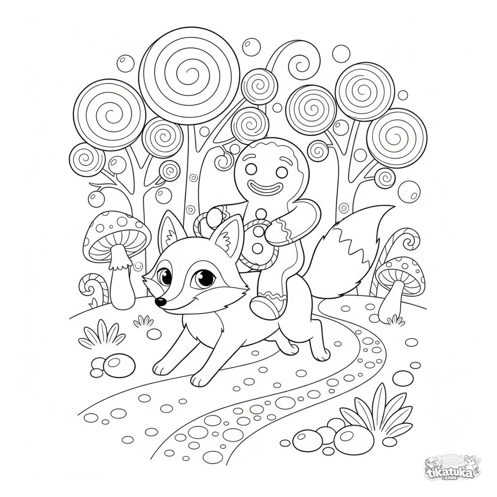 Página para colorear de cuento: un hombre de jengibre monta un zorro a través de un bosque de dulces mágico. Para niños de 5 a 8 años.