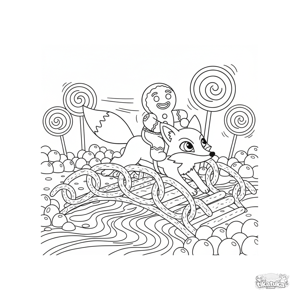 Página para colorear de cuento: un hombre de jengibre monta un zorro por un puente sobre un río de chocolate. Para niños de 5 a 8 años.