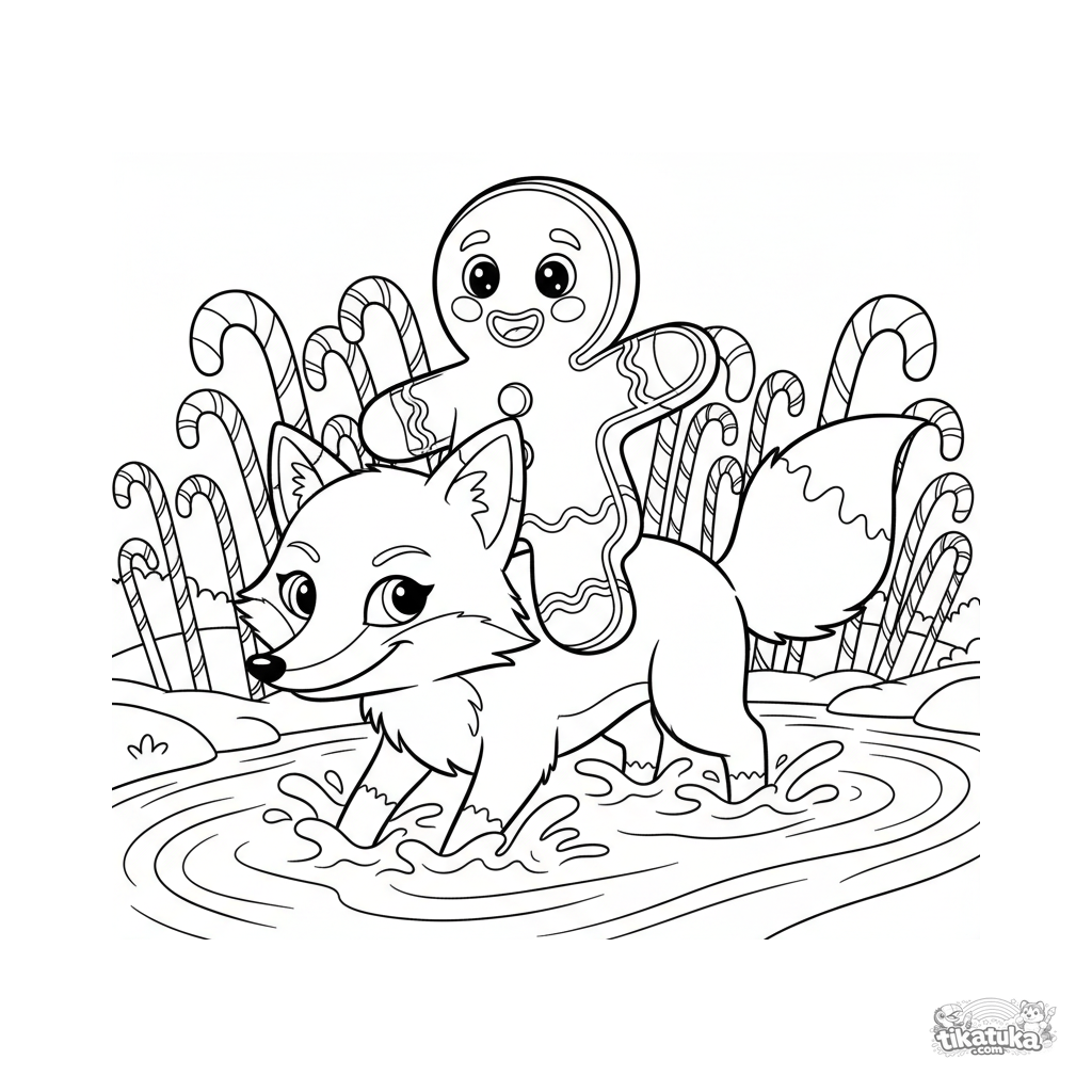 Página para colorear del cuento: el Hombre de Jengibre montando un zorro a través de un río de leche. Para 6-9 años. Se agarra al pelaje del zorro, con cañas de caramelo en la orilla.