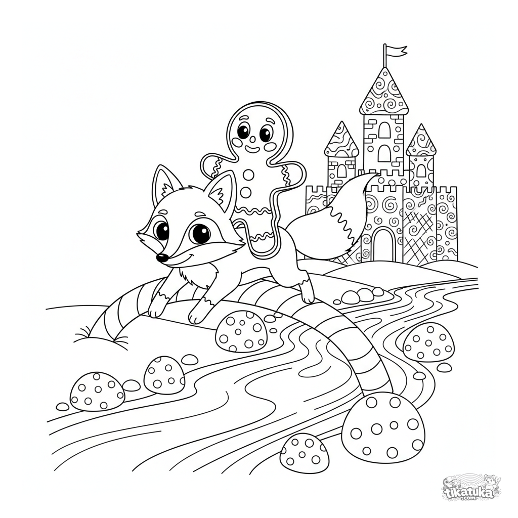 Página para colorear del cuento del Hombre de Jengibre, cruzando el Río de Leche sobre un zorro. Para niños de 6 a 9 años. Escena detallada con puente de bastón de caramelo y castillo de galleta.