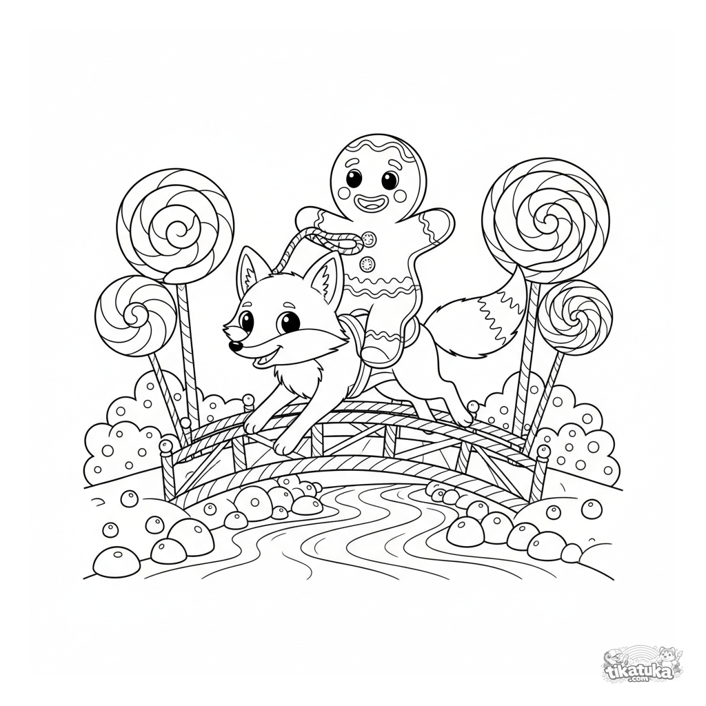 Página para colorear de un cuento: un hombre de jengibre monta un zorro por un puente de menta sobre un río de chocolate. Para niños de 6 a 9 años.