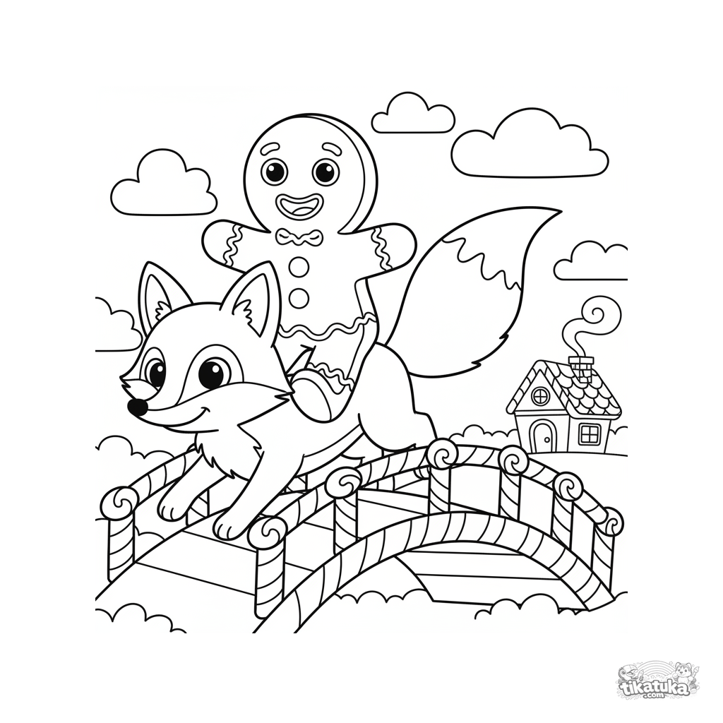 Página simple para colorear de cuento: un hombre de jengibre monta un zorro por un puente de dulces. Para niños pequeños de 2 a 5 años.