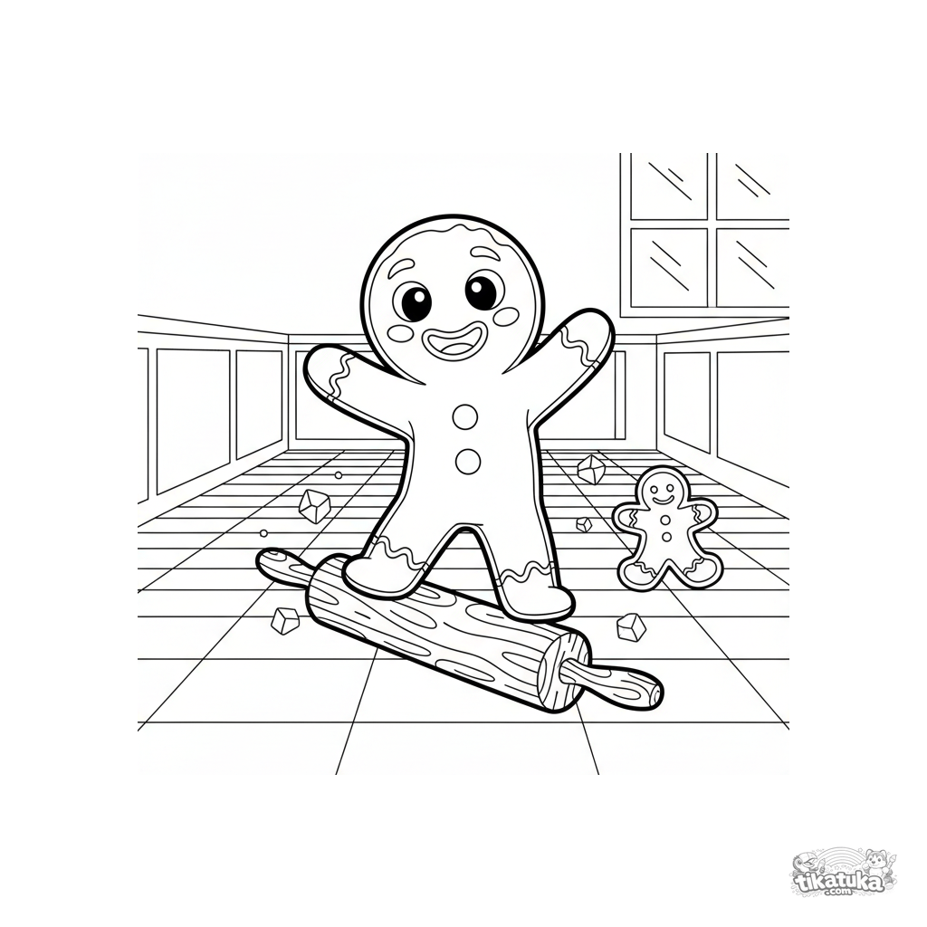 Página de cuento para colorear para niños 4-6: un alegre Hombre de Jengibre monta un rodillo como patineta por el suelo ajedrezado de una cocina. Escena dinámica, detalle medio.