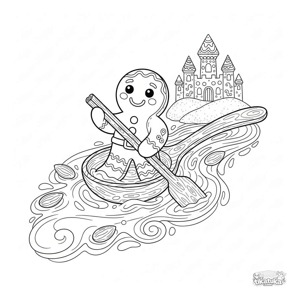 Página para colorear de un feliz Hombre de Jengibre navegando en un bote cuchara por un río de leche. Para niños de 5 a 8 años.