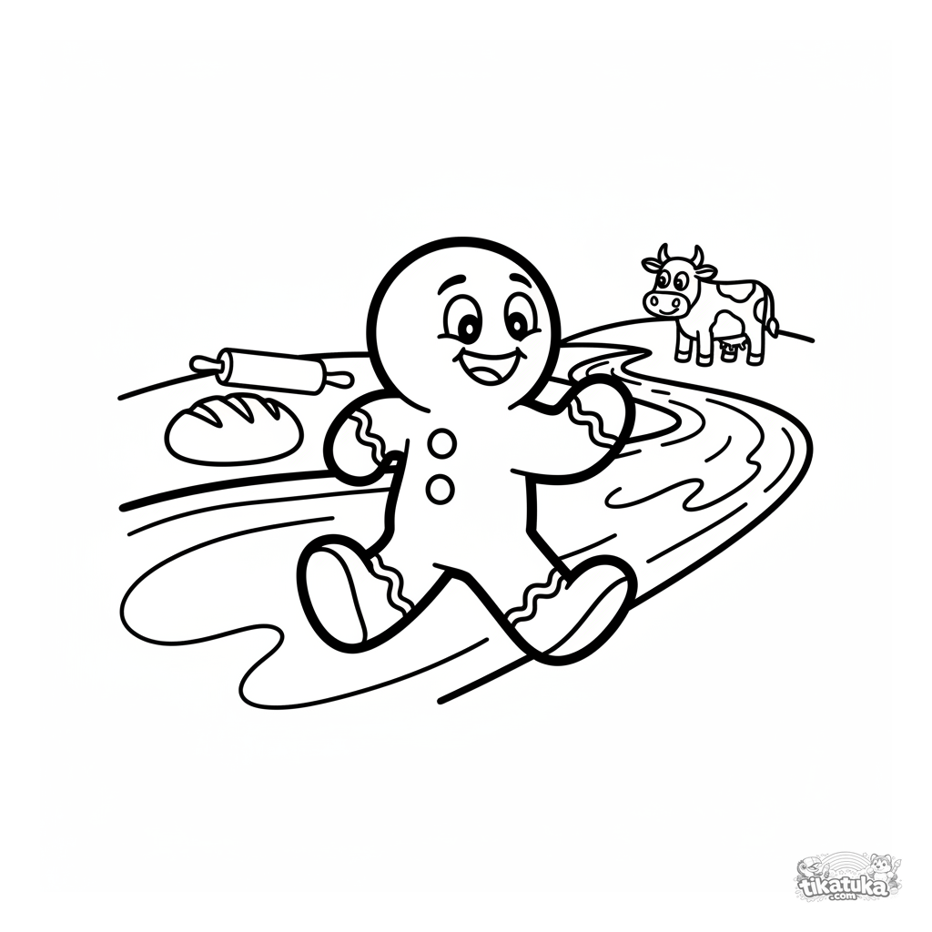 Página para colorear del cuento del Hombre de Jengibre. Para niños pequeños de 2 a 5 años. El hombre huye de un río de leche, un pan y un rodillo en el camino. Contornos muy simples y grandes.