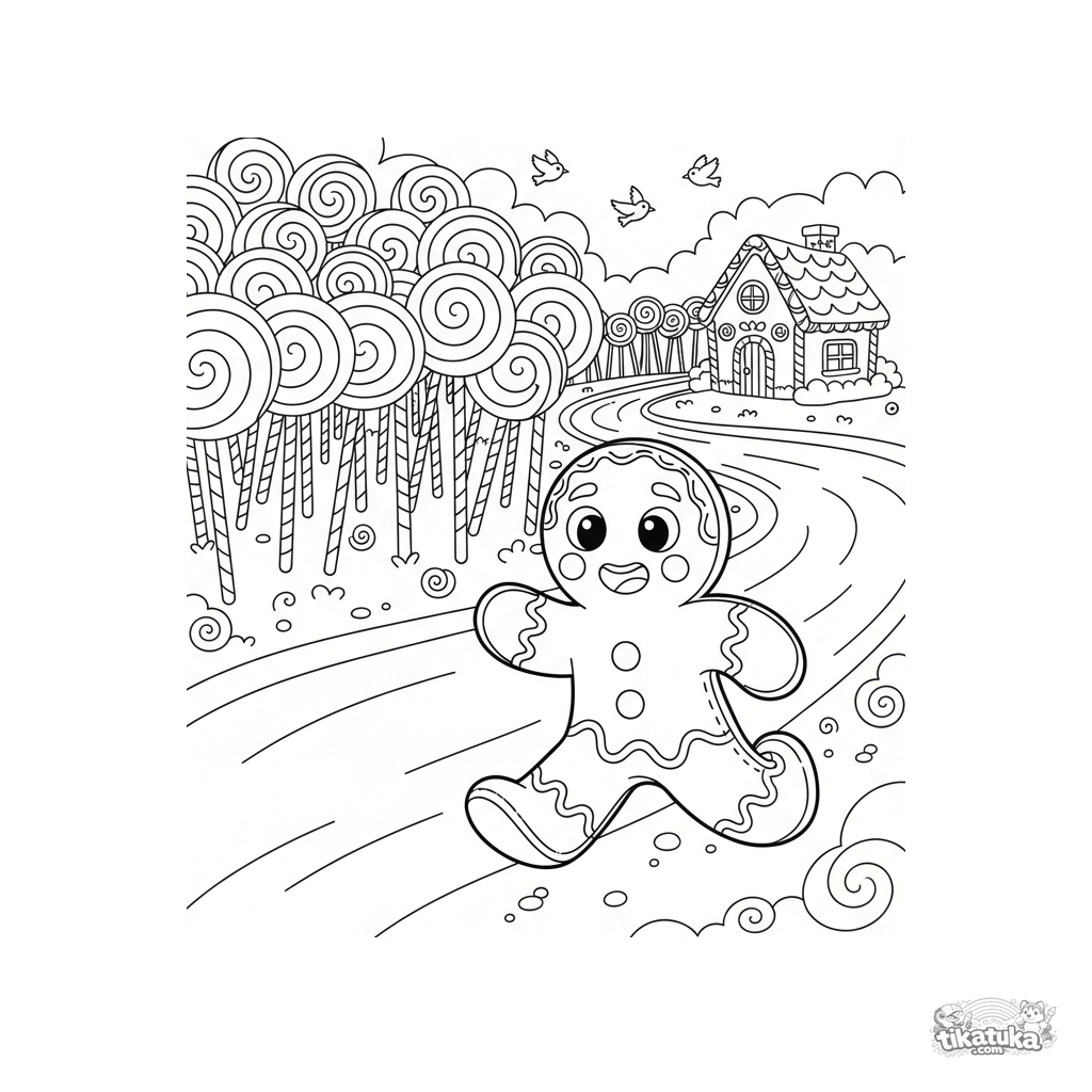 Página para colorear de cuento: El Hombre de Jengibre corre alarmado hacia un río de leche, con un bosque de caramelos al fondo. Escena detallada para 7-12 años.