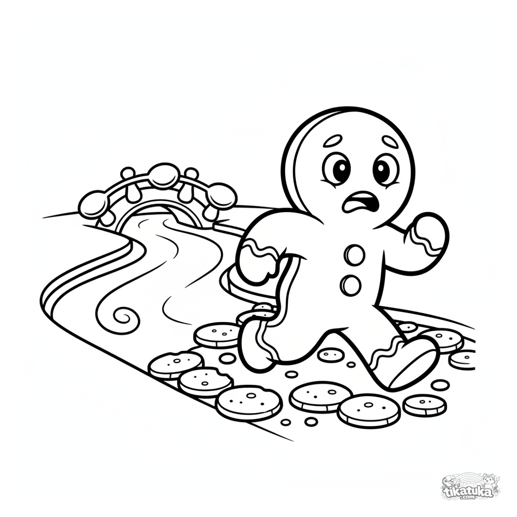 Página para colorear para niños pequeños de 2-3 años: El Hombre de Jengibre huyendo de un río de leche. Formas muy simples y grandes, perfectas para primeras experiencias de colorear.