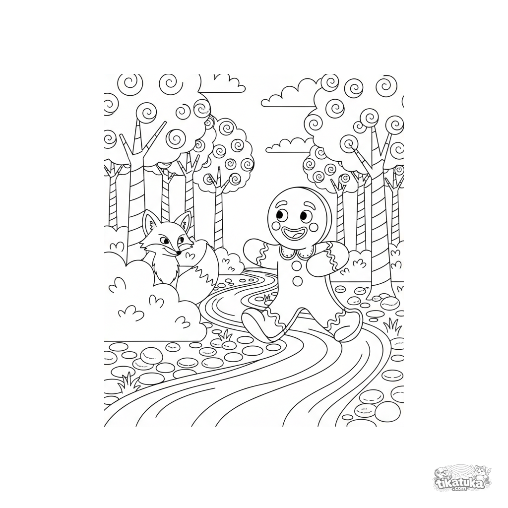 Página para colorear del cuento del Hombre de Jengibre, huyendo del zorro junto al Río de Leche en un Bosque de Dulces. Para niños mayores de 7 a 12 años.