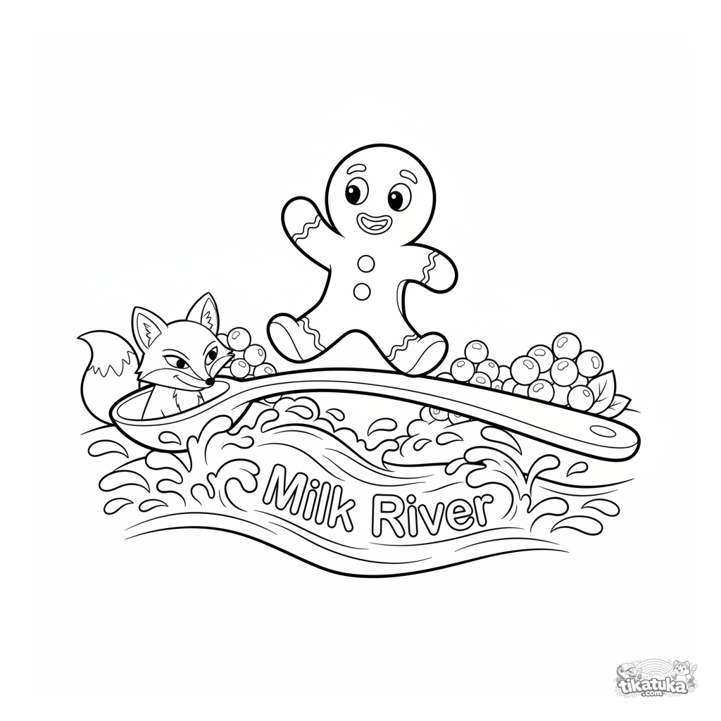 Página para colorear del cuento del Hombre de Jengibre, cruzando un puente-cuchara sobre el Río de Leche. Para niños de 4 a 6 años.