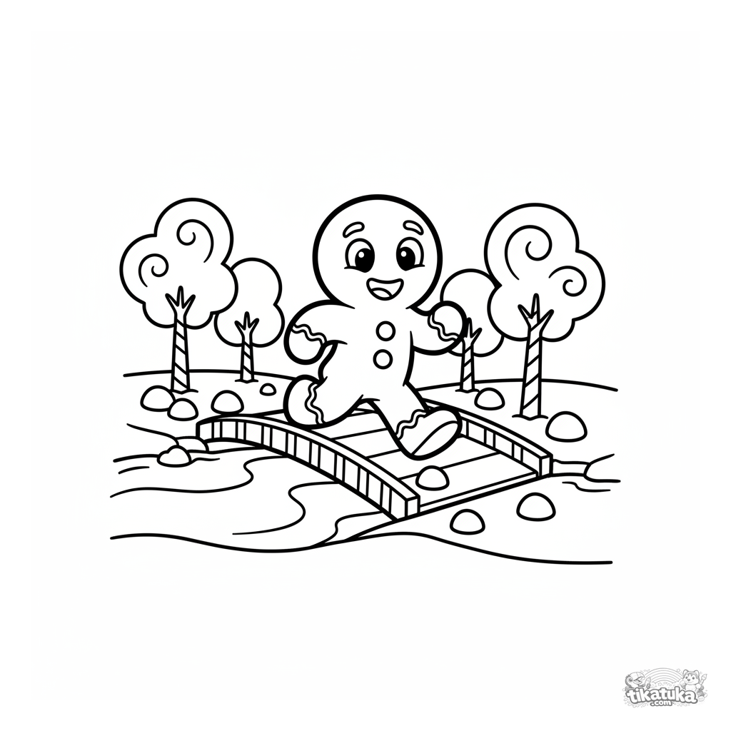 Página simple para colorear para bebés 2-3 años: El Hombre de Jengibre corre feliz por un puente de galleta huyendo de un río de leche. Formas grandes y claras.