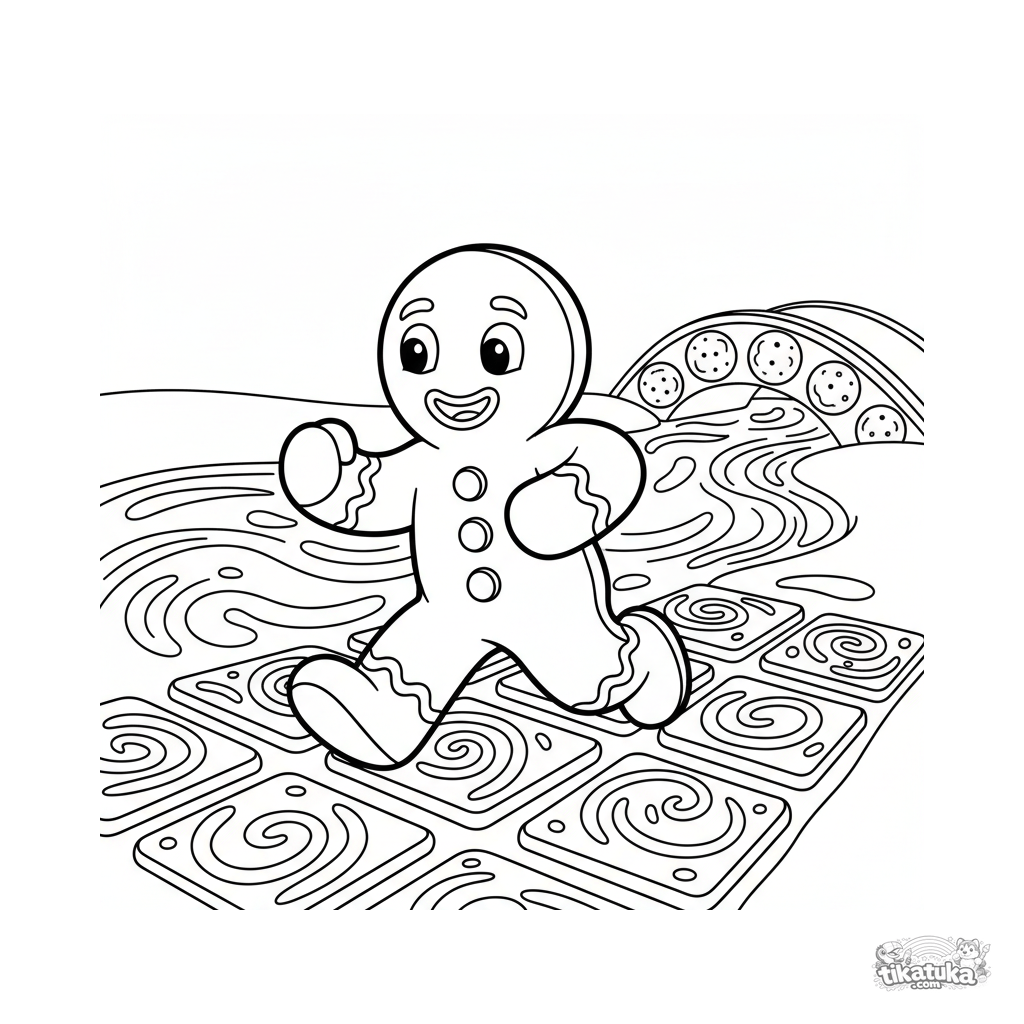 Página simple para colorear para niños pequeños de 2-3 años: el alegre Hombre de Jengibre corre por un camino hacia un río de leche. Formas grandes y simples.