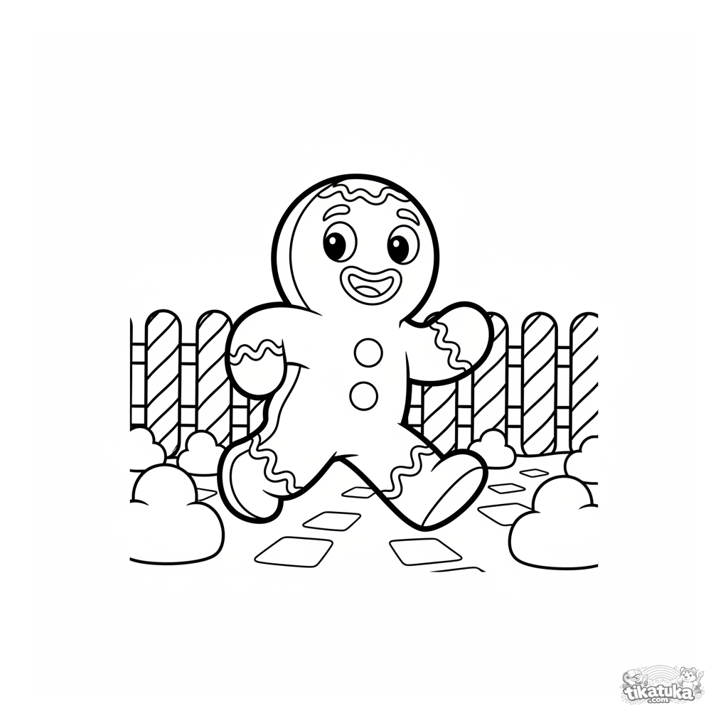 Página simple para colorear para niños pequeños 2-4: el Hombre de Jengibre huyendo. Grandes áreas para colorear, personaje de cuento reconocible.