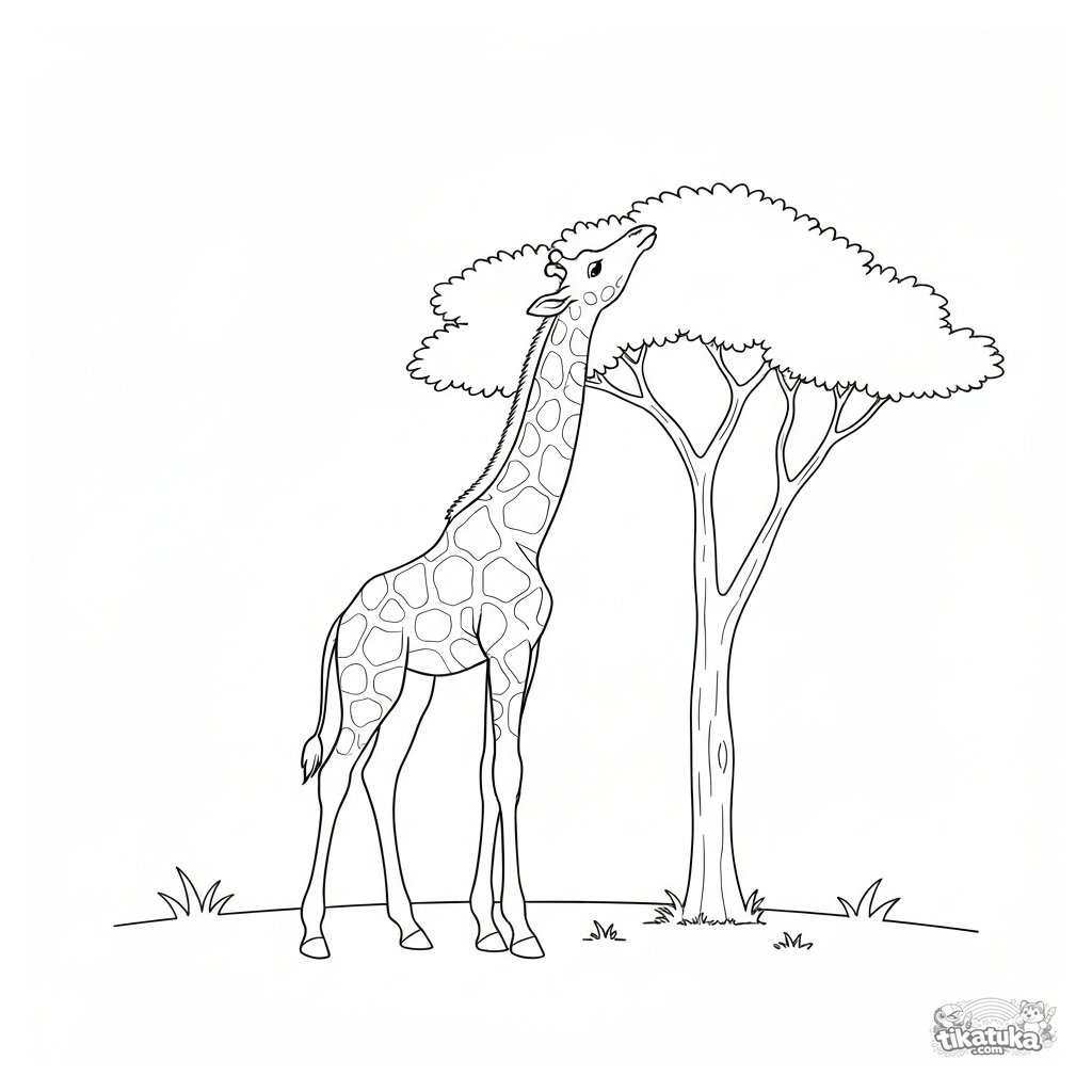 Página para colorear para niños: una jirafa bebé alcanza hojas de acacia. Estilo realista simplificado, para 3-5 años.