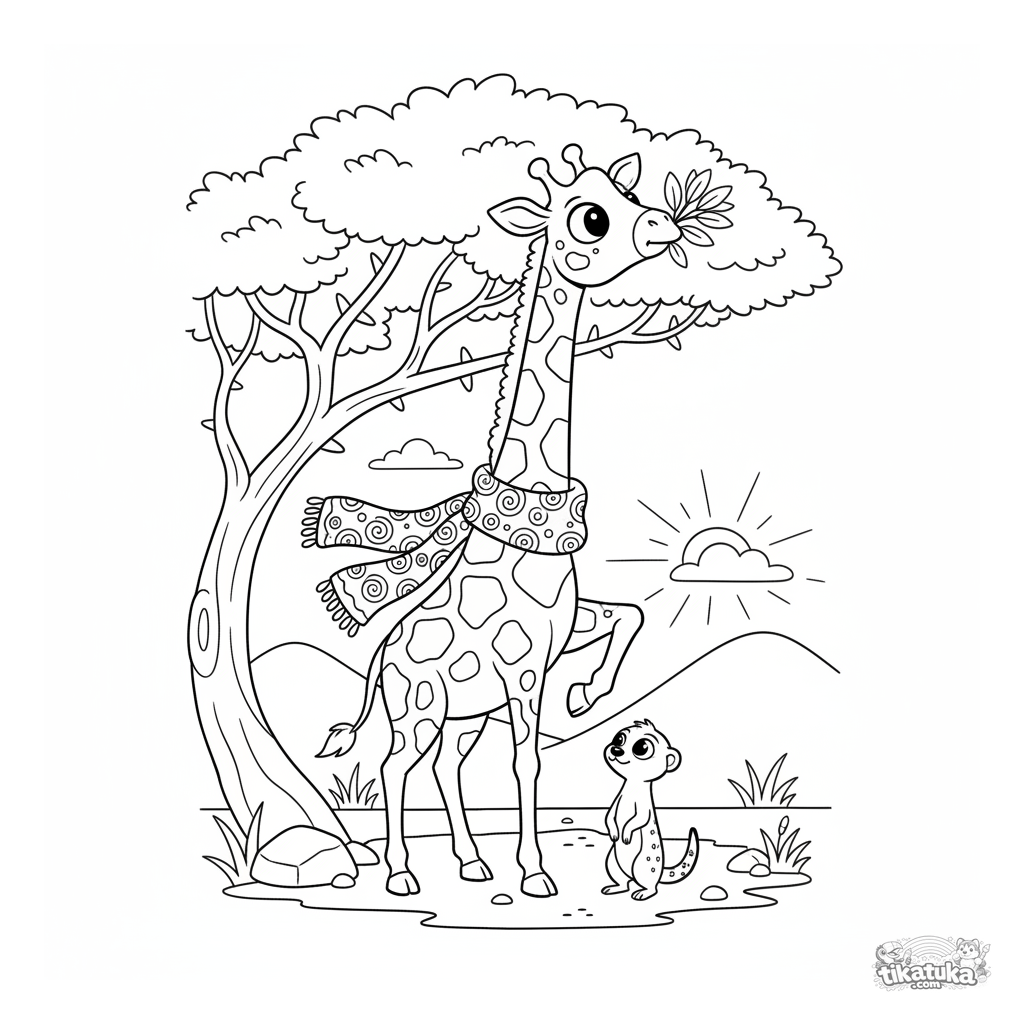 Página para colorear para niños de 4-6 años: una jirafa con bufanda alcanza hojas de acacia en la sabana. Un lindo suricata observa. Formas simples, ideal para principiantes.
