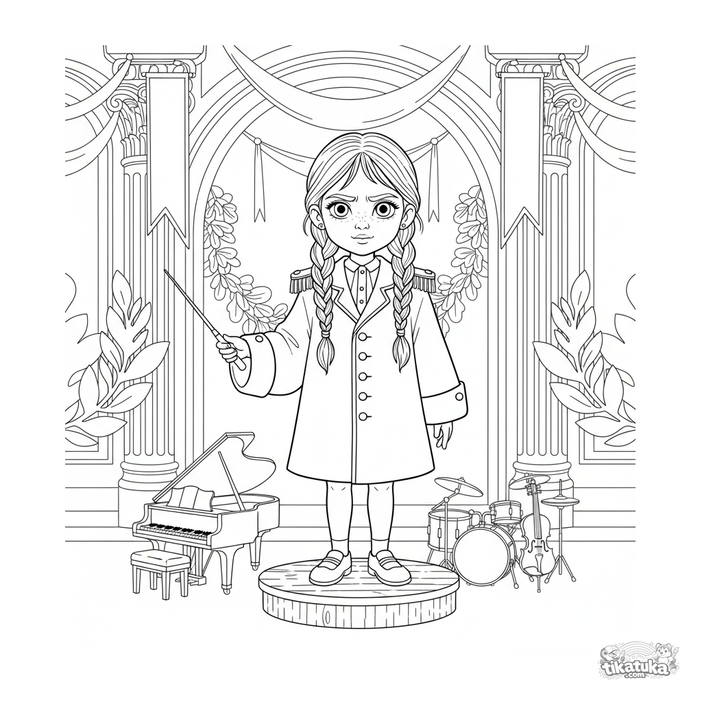 Página para colorear para 4-6 años: una niña dirigiendo una orquesta de juguetes en un salón festivo. Formas claras, detalle moderado, figura completa.