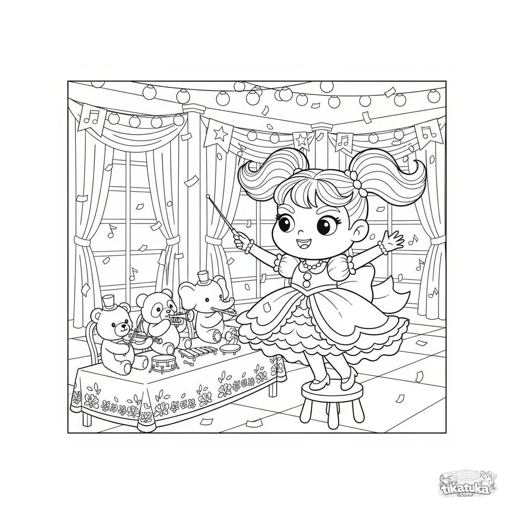 Página para colorear para niños 4-6: una niña alegre en un salón festivo dirige una orquesta de juguetes de peluche en una mesa banquete. Escena con banderines y globos.