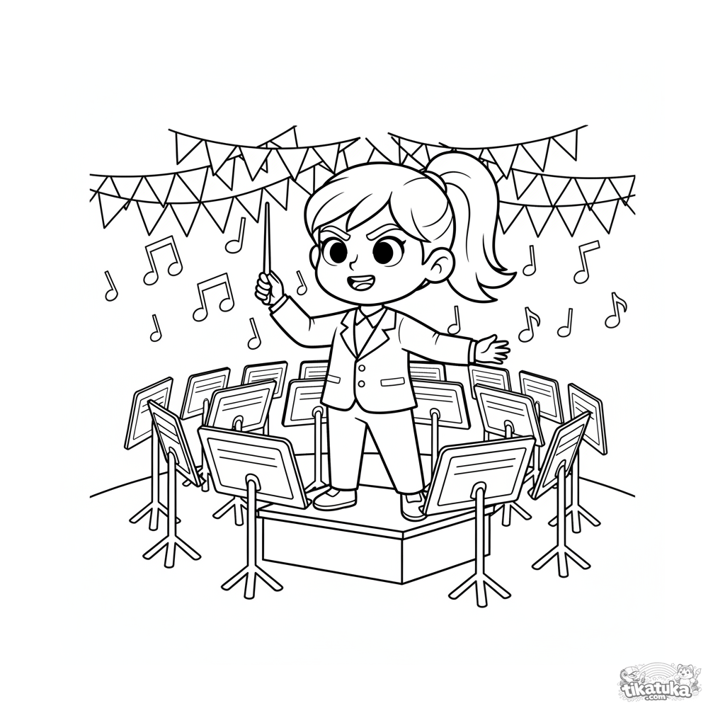 Página para colorear para niños 7-9: una niña directora lidera una orquesta en un salón festivo. Pose dinámica, detalle moderado.