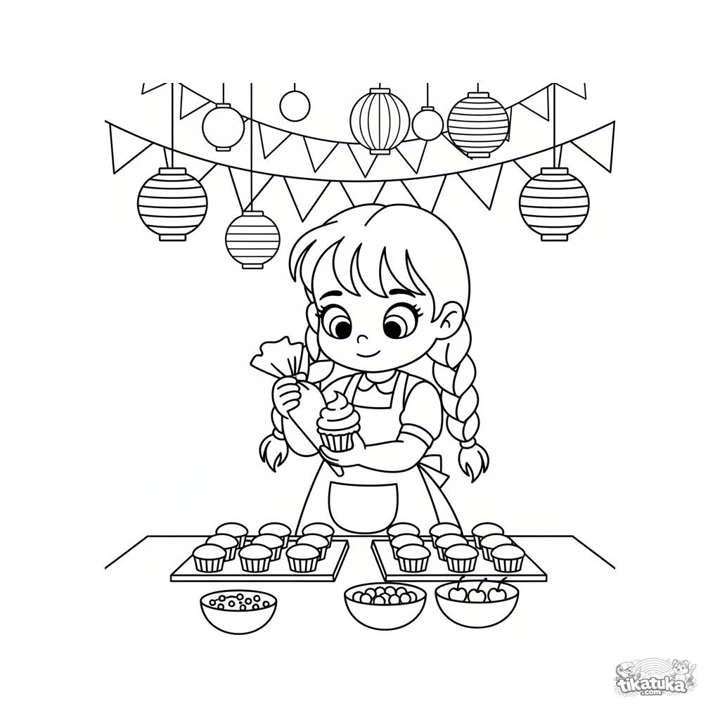 Página para colorear para niños de 4-6 años: una niña con delantal se concentra en decorar cupcakes con glaseado y chispas en una mesa de un salón festivo. Cuerpo completo visible.