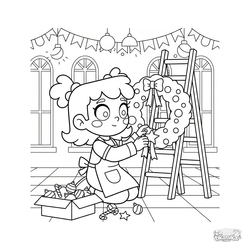 Página para colorear para niños 7-9: una niña decora una gran corona festiva en un salón.