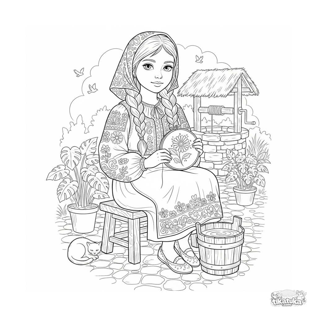 Página para colorear para mayores 10-12: una niña con traje tradicional bordando junto a un pozo de agua viva. Escena detallada de la vida rural con patrones y un cubo.