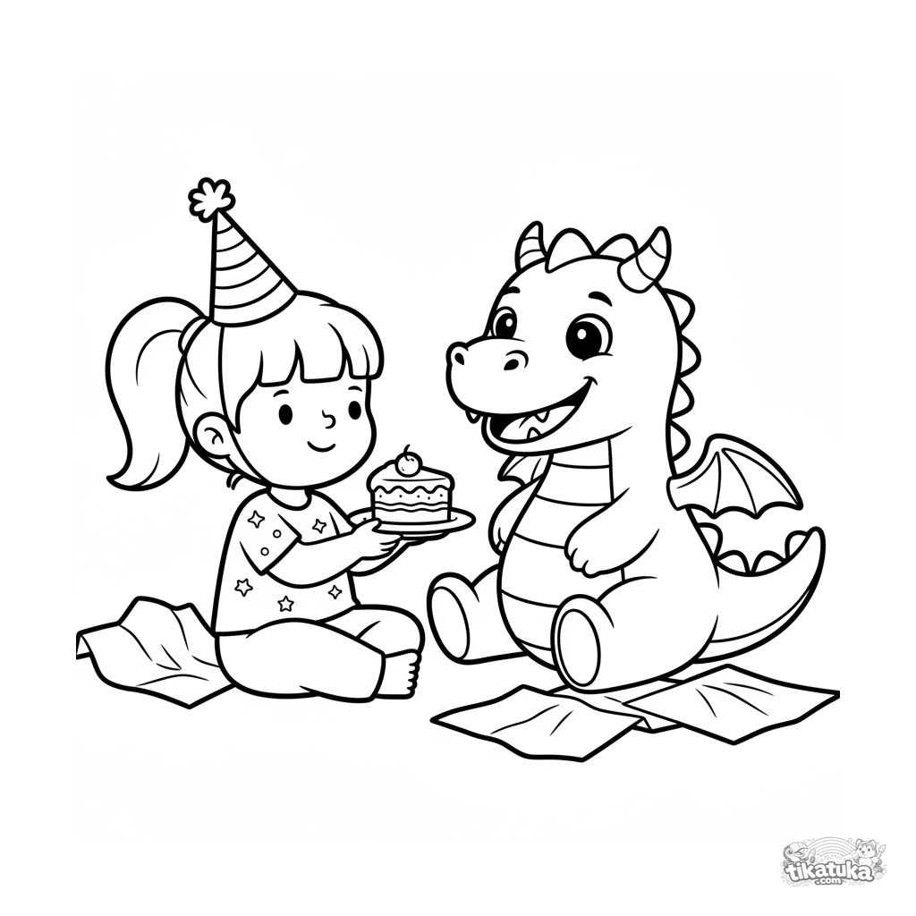 Página para colorear muy simple para niños pequeños 2-3: una niña con sombrero de fiesta sentada en el suelo alimentando con un trozo de pastel a un gran dragón de peluche en un salón festivo. Formas grandes y claras.