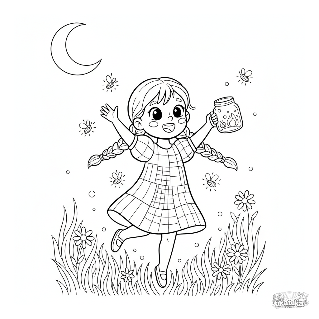 Página para colorear para niñas: una niña con vestido persigue luciérnagas en un prado de verano. Para niños de 5 a 7 años.