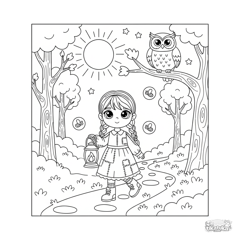Página para colorear para niñas: una niña con vestido camina por un sendero del bosque con una linterna. Para niños de 4-6 años. Noche de luna con luciérnagas y un búho.