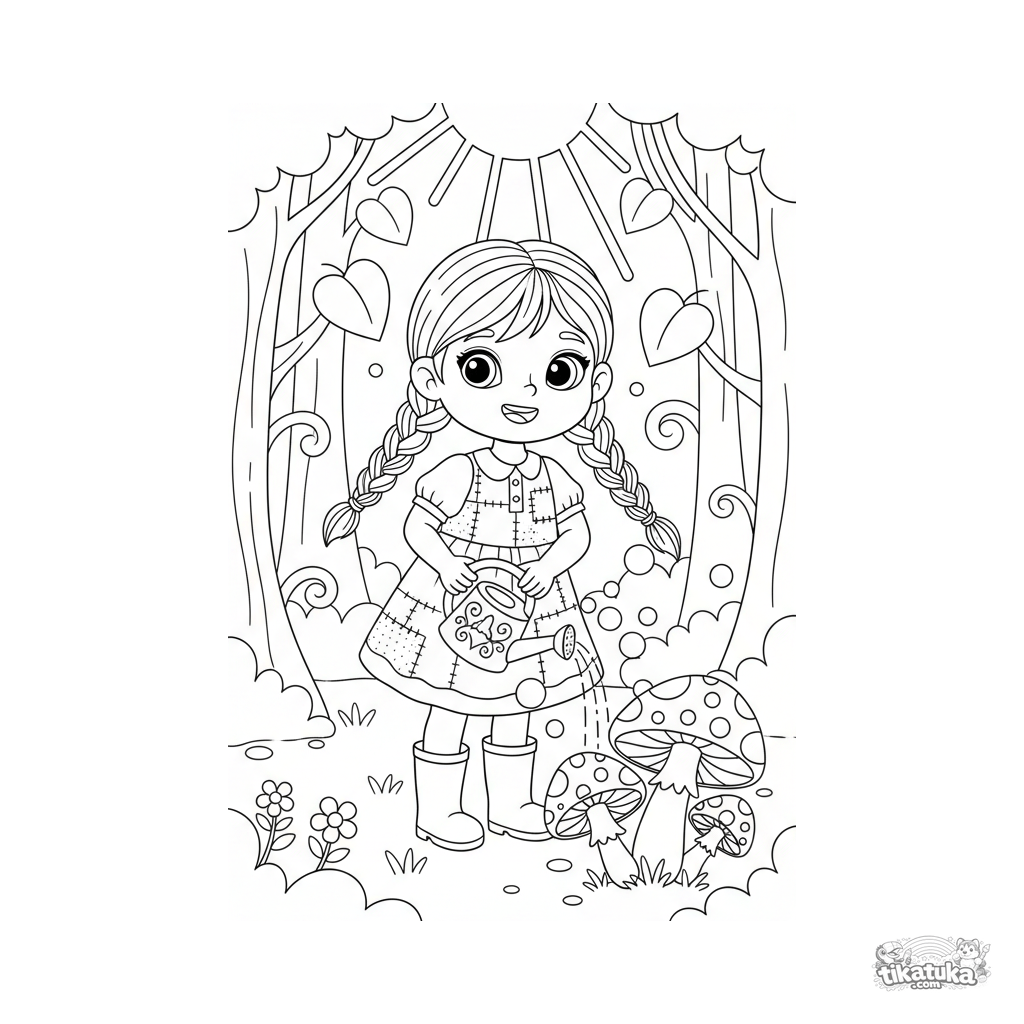 Página para colorear para niñas de 4-6 años: una niña alegre riega hongos gigantes en un bosque encantado. Escena amable y simple para colorear.